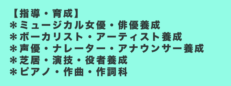 《ミュージカル科》 未経験から指導していた綿引さやかが、一般応募15000人の中から東宝ミュージカル 「レ・ミゼラブル」のエポニーヌ役に抜擢!等、舞台で活躍する役者、歌手、ダンサー達を、 数多く基礎から歌唱演出まで担い、育て、世に排出しております。 また、オーディションの対策等をも前面バックアップ致しております